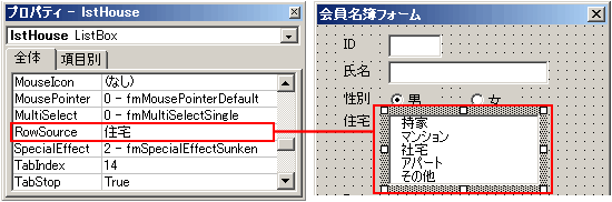 RowSourceプロパティは、ワークシートに入力されているリストをリストボックスやコンボボックスの一覧に表示するためのプロパティです。セルに範囲名が設定されている場合は、このプロパティの設定として範囲名を入力します。この例では、ワークシートの住宅のリスト範囲に、あらかじめ住宅という名前が付けられているので、RowSourceプロパティにそれを設定するとユーザーフォーム内に表示されます。