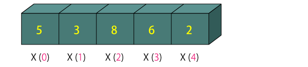 データへのアクセスは、インデックス(添え字)と呼ばれる番号で、何番目の要素かを指定してアクセスします。